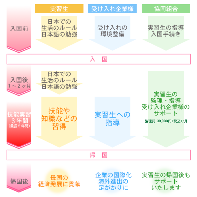私たち「ときわくらぶ協同組合」は、法務大臣及び厚生労働大臣に許可を受けて技能実習生を斡旋している公の監理団体です。技能実習生の入国準備、入国前・後講習など、難しく感じられる手続きは当組合が行いますのでご安心ください。また、我々監理団体は3年ごとの講習を受けていること、外部からの監査をされていることで、常に適正な監理を行っております。受け入れ企業様も、技能実習生も、安心して制度を受けられるよう心がけております。